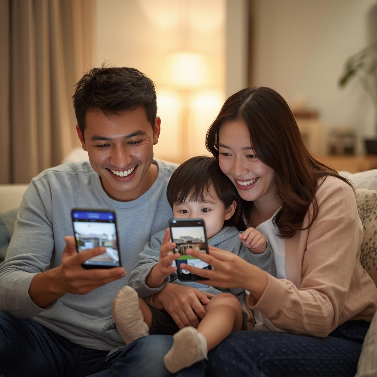 照明が灯ったリビングや寝室の雰囲気、