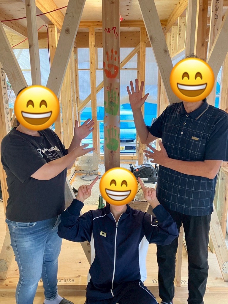 そうしてトイレ工事をさせて頂いていた時に、場所を変えてこちらでは先日上棟させて頂いたN様・F様邸で早速現地にて電気の打ち合わせなどをさせて頂き、記念の手形もして頂きました🤲