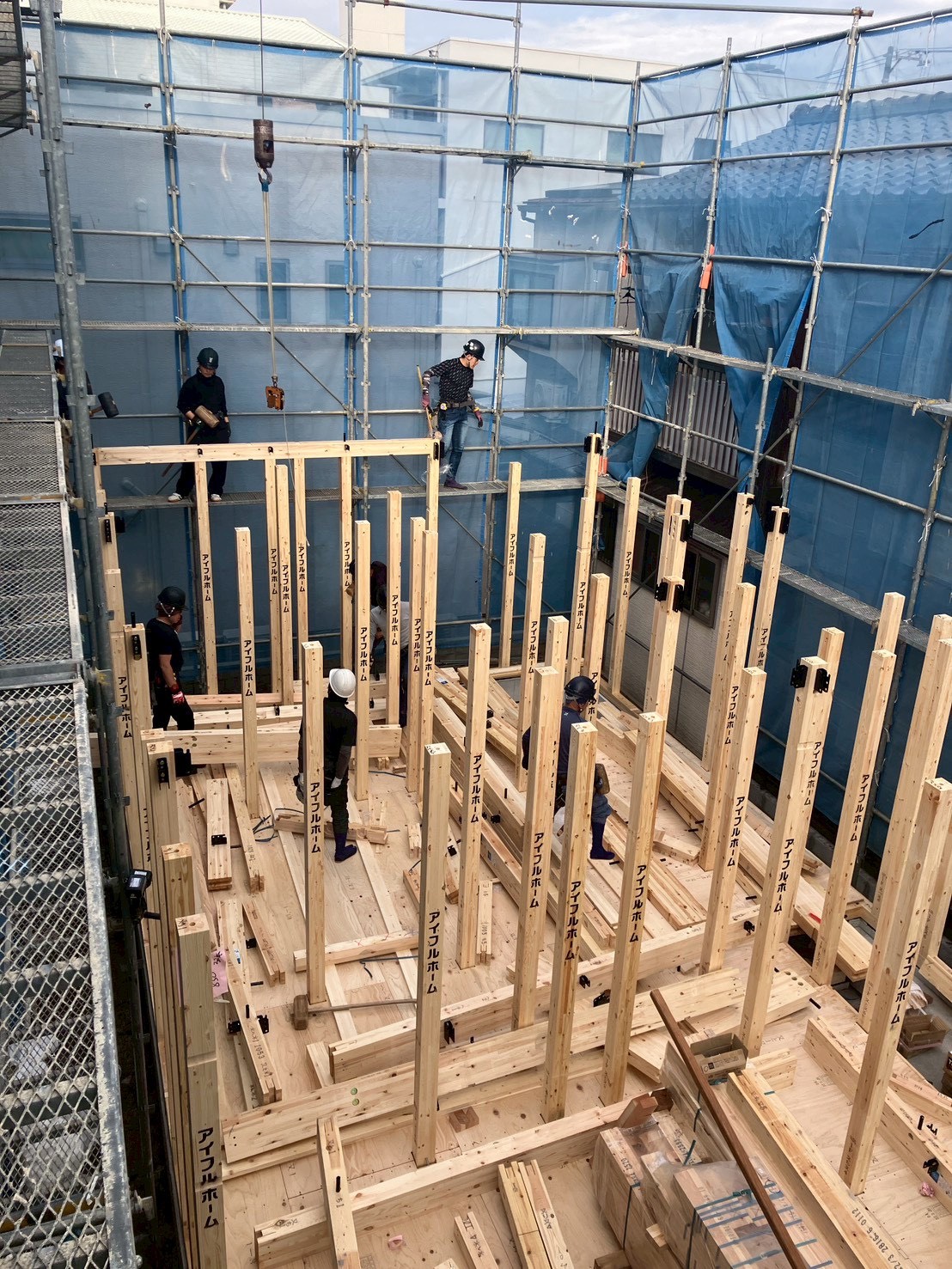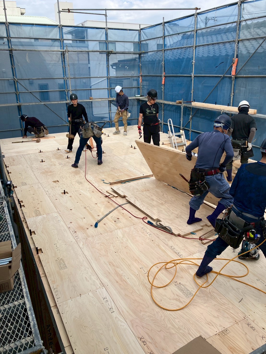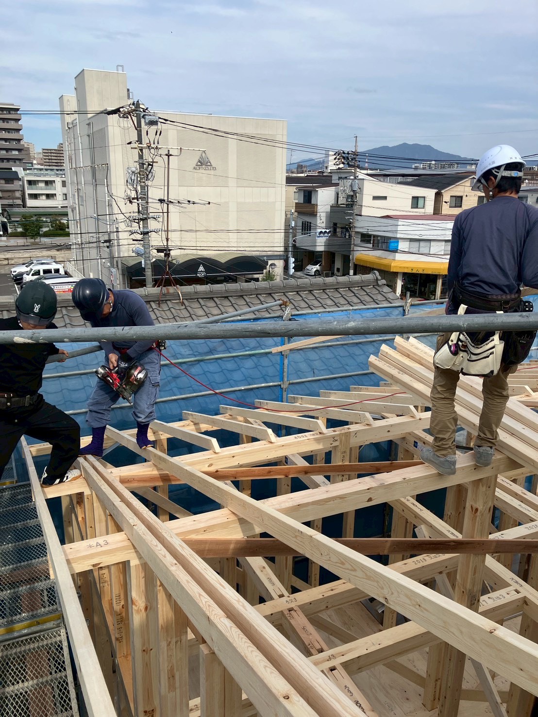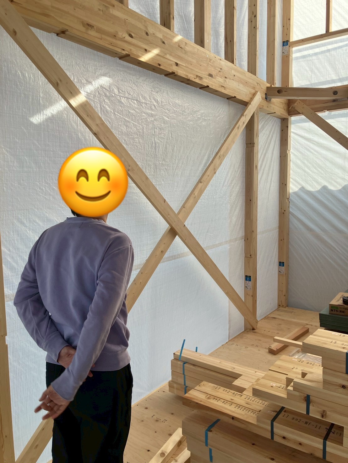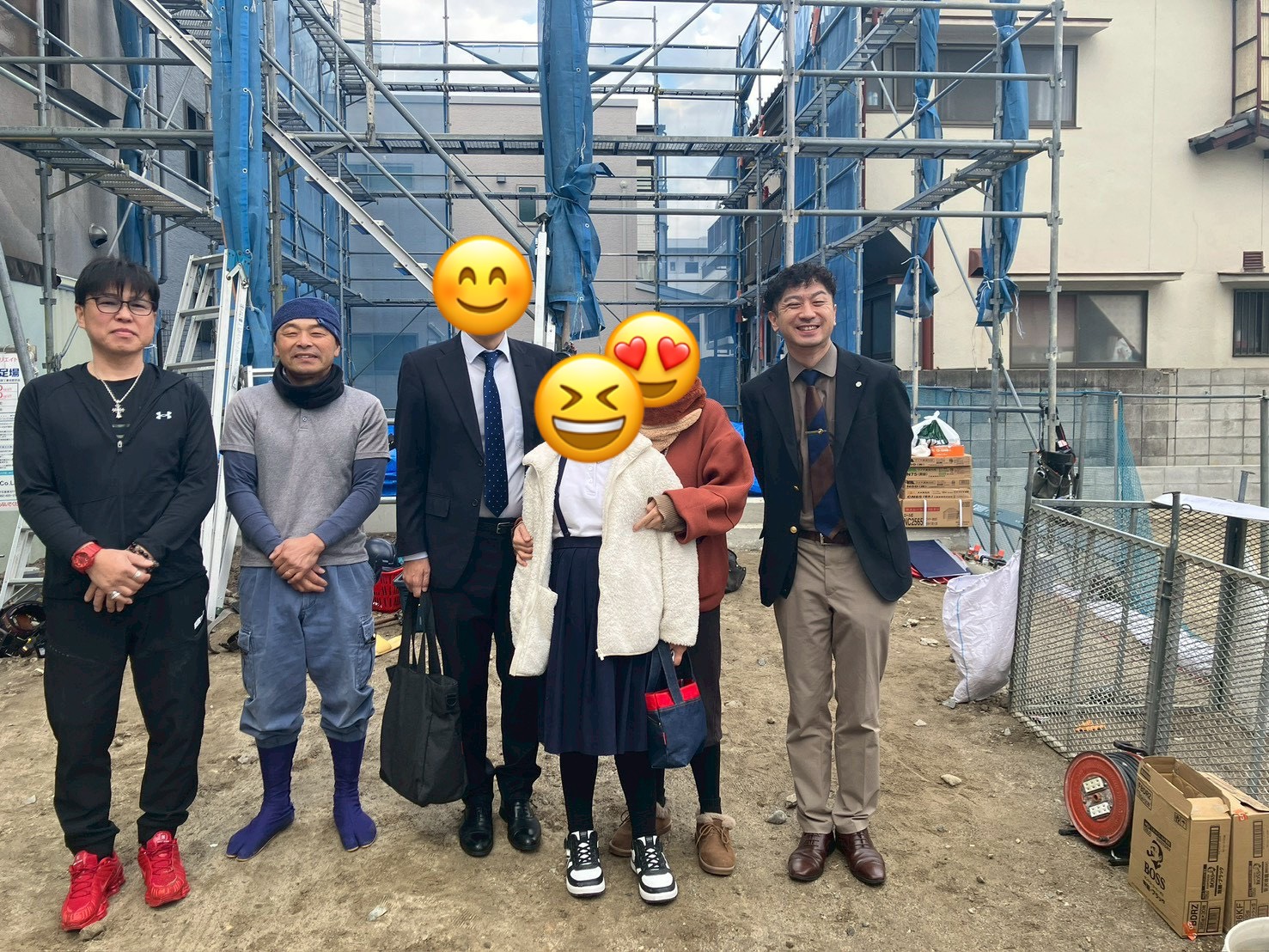 写真は奥さまがお仕事であまり現場に滞在できないということで、朝営業の別宮さんと大工さんとの記念写真を撮らせていただきました。