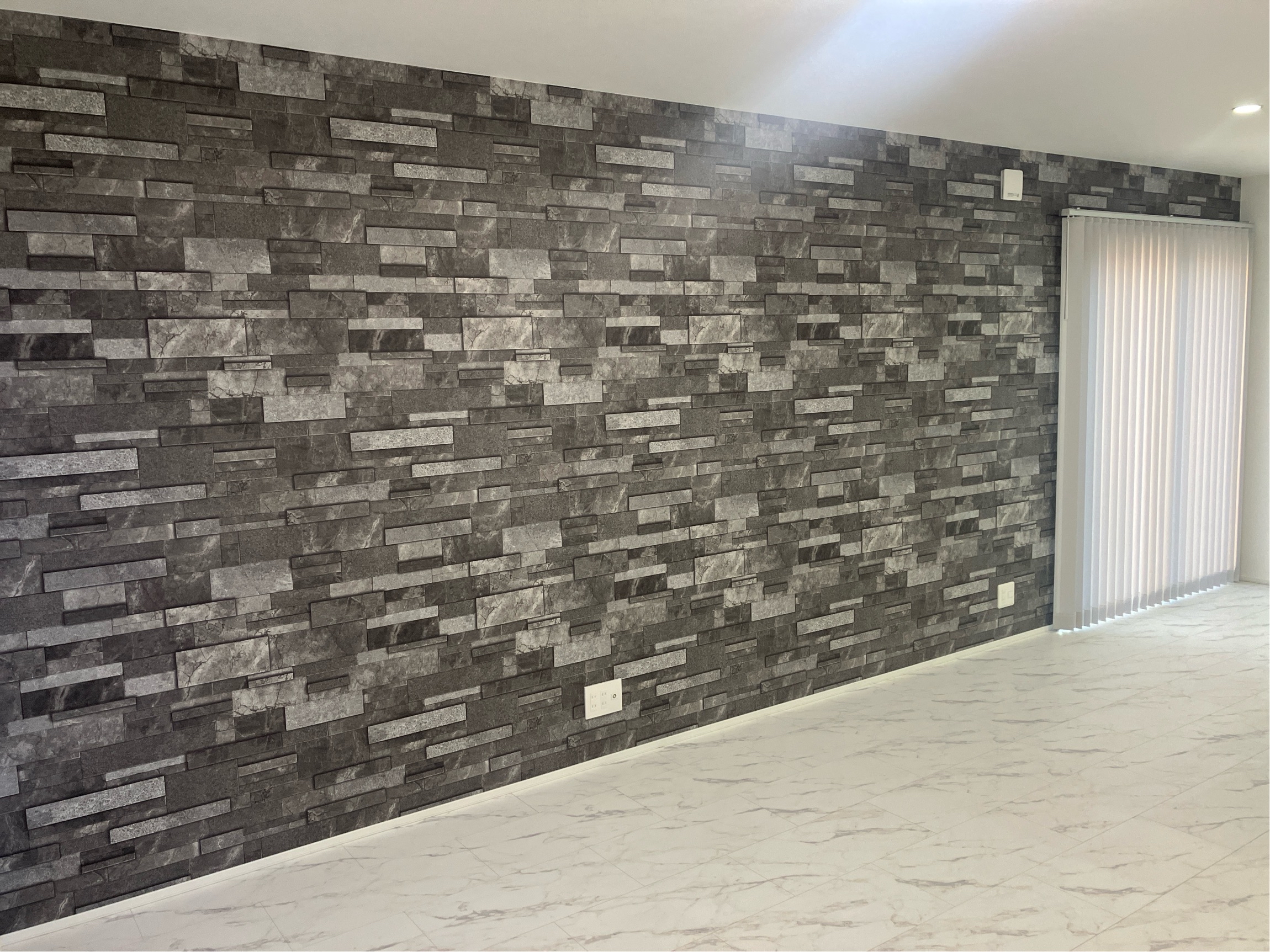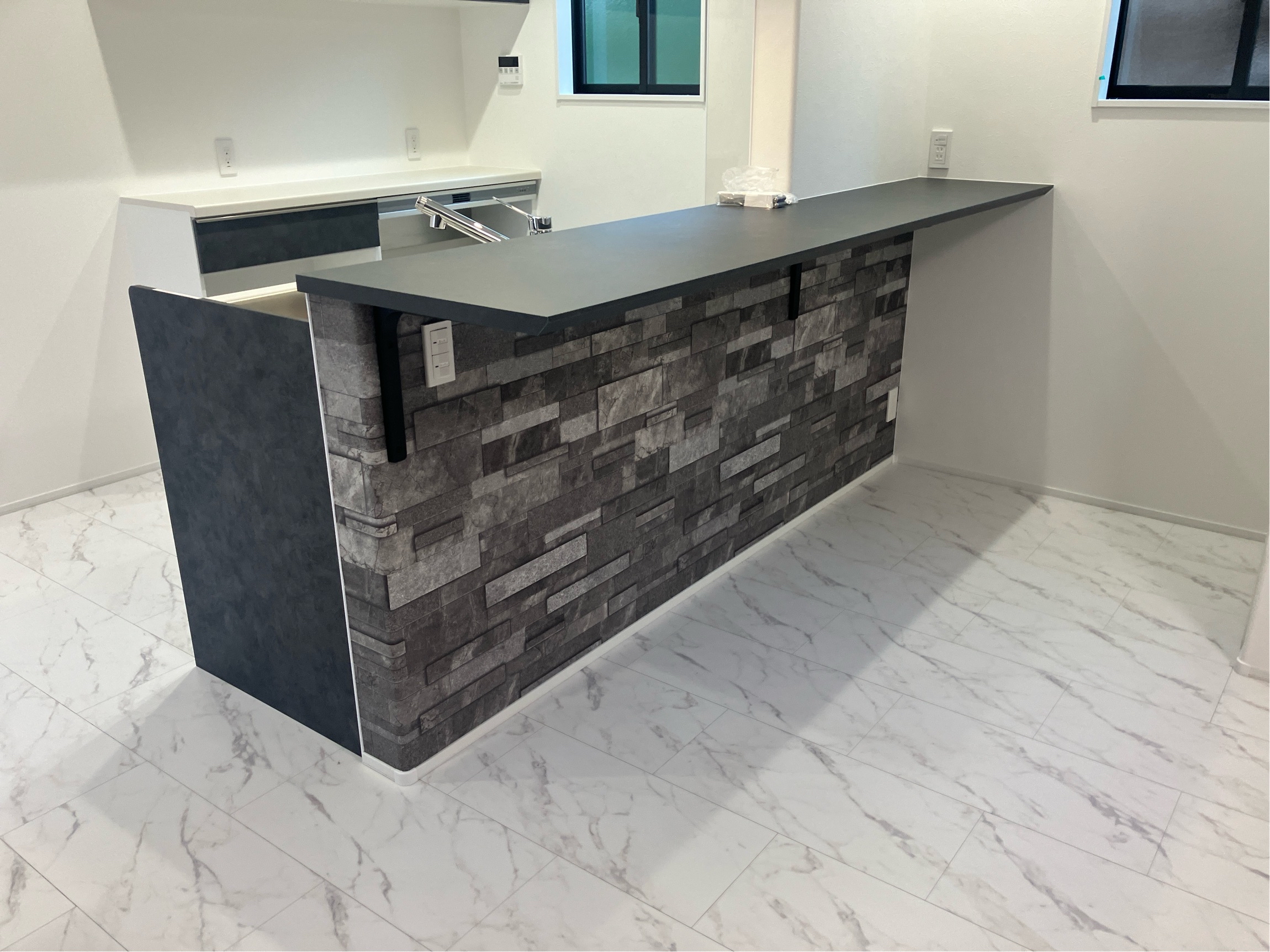 リビングの一面をタイル柄で、キッチンの対面側も合わせて同じクロスで仕上げてあります。