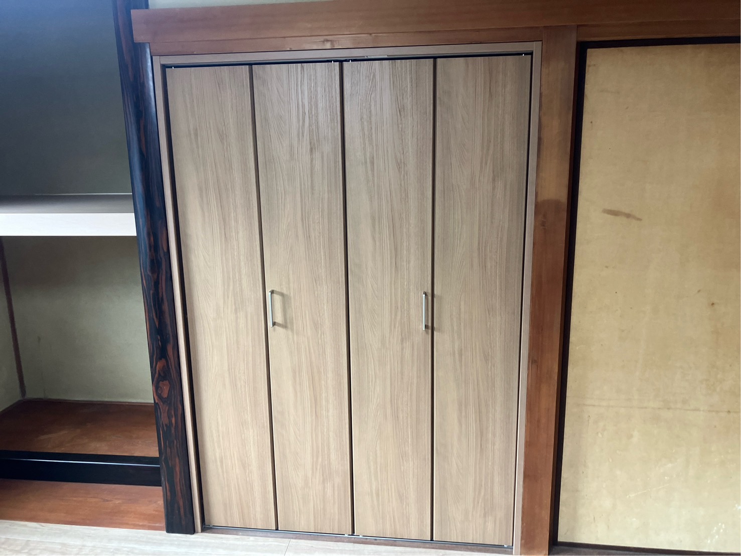 今回和室の畳からフローリングに替えさせて頂いて、押し入れも折戸の収納に取替とさせて頂きました。