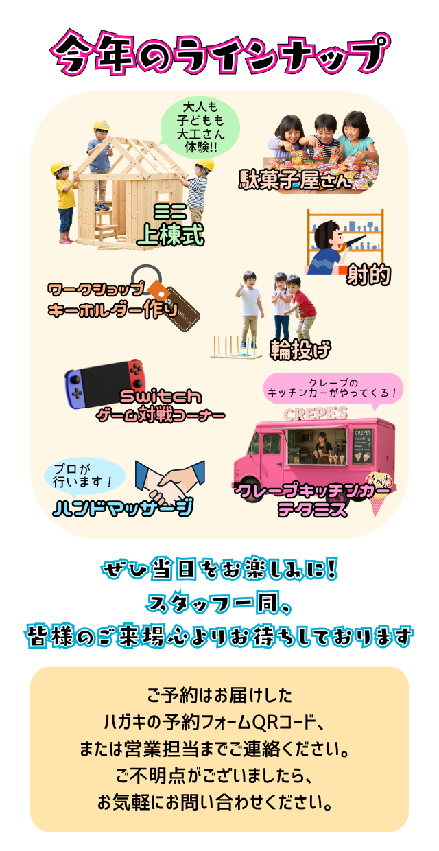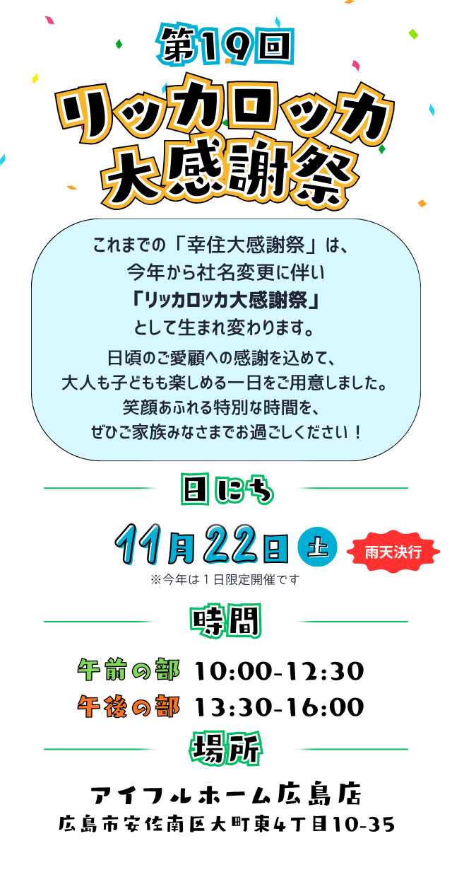 Eventイベント 第19回リッカロッカ大感謝祭 イベント 終了 2025.11.22(土)〜11.22(土) その他のイベント 【広島店/広島南店】【Amazonギフト券】見学会予約来場で最大8,000円キャンペーン開催! イベント 受付中 2026/1/10(土)〜2/8(日) 【広島店・広島南店】2026年新春初売りフェア イベント 受付中 2026/1/1(木)〜1/31(土) 家族とゆっくりすごすための、家事ラク動線見学会 見学会 受付中 2026/1/1(木)〜1/31(土) BACK TO LIST HOME イベント 第19回リッカロッカ大感謝祭
