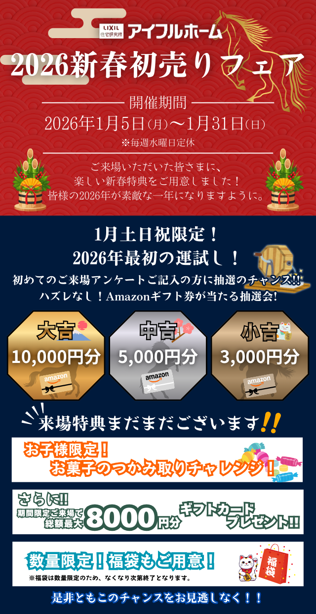 Eventイベント 【広島店・広島南店】2026年新春初売りフェア イベント 受付中 2026.1.1(木)〜1.31(土) 2026年のはじまりに、感謝を込めたお得なキャンペーンを開催いたします!! イベント来場予約 下記の情報に御記入の上、【送信】ボタンをクリックしてください。折り返し弊社より御連絡させていただきます。 ※ 半角カナは使用しないでください。 ※ 【必須】は入力必須項目です。 ※ 当日のご予約は、お電話のみのご対応になります。 参加希望イベント名 【広島店・広島南店】2026年新春初売りフェア お名前 ふりがな 電話番号 メールアドレス ご住所 郵便番号 都道府県 選択してください北海道青森県岩手県宮城県秋田県山形県福島県茨城県栃木県群馬県埼玉県千葉県東京都神奈川県新潟県富山県石川県福井県山梨県長野県岐阜県静岡県愛知県三重県滋賀県京都府大阪府兵庫県奈良県和歌山県鳥取県島根県岡山県広島県山口県徳島県香川県愛媛県高知県福岡県佐賀県長崎県熊本県大分県宮崎県鹿児島県沖縄県 市区町村番地建物 お問い合わせ内容 第1希望日 来場時間を選択 第2希望日 来場時間を選択 第3希望日 来場時間を選択 ご参加人数 大人 1人2人3人4人5人以上 11歳以下 0人1人2人3人4人5人以上 6歳以下 0人1人2人3人4人5人以上 3歳以下 0人1人2人3人4人5人以上 当社の個人情報保護方針について、ご同意の上、確認画面へお進みください。 同意する Japan その他のイベント 【広島店/広島南店】【Amazonギフト券】見学会予約来場で最大8,000円キャンペーン開催! イベント 受付中 2026/1/10(土)〜2/8(日) 家族とゆっくりすごすための、家事ラク動線見学会 見学会 受付中 2026/1/1(木)〜1/31(土) 【紹介した方も!】紹介特典あります!【紹介された方も!】 その他 受付中 2026/1/1(木)〜1/31(土) BACK TO LIST HOME イベント 【広島店・広島南店】2026年新春初売りフェア